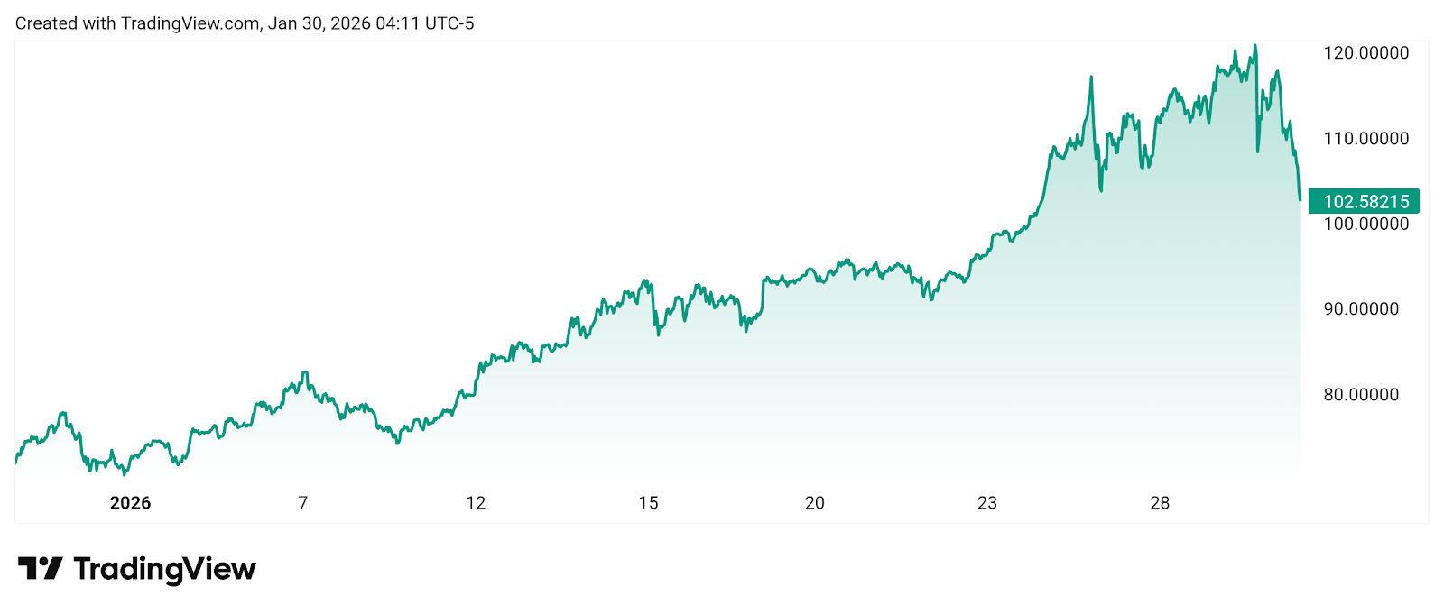 白银价格报每盎司107.83美元,单日下跌5.83%,过去30天累计上涨51.95%。其双重属性——既是避险资产又是工业金属——导致价格波动剧烈。花旗分析师指出,清洁能源与制造业复苏预期推动需求上升,但快速获利回吐引发短期调整。