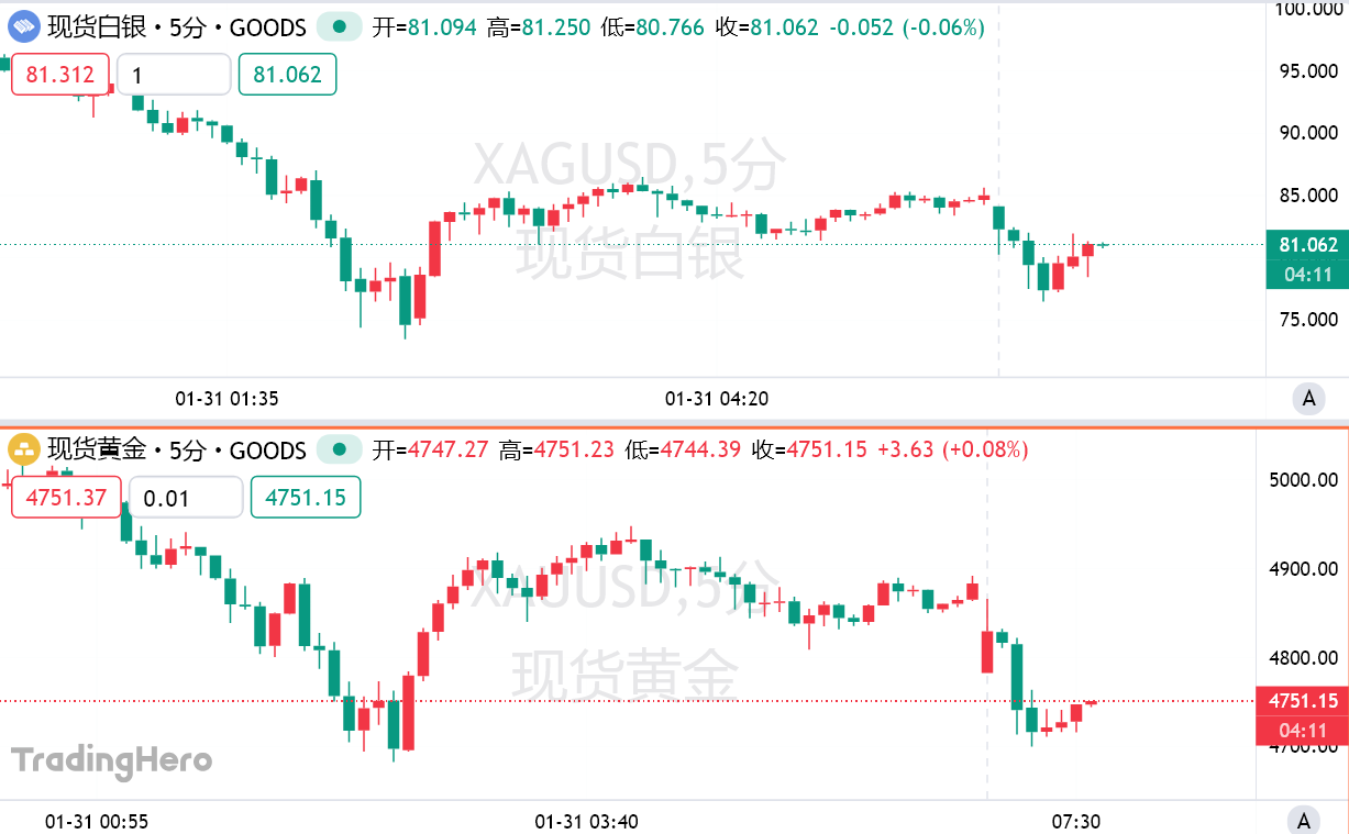 周一亚市开盘,贵金属市场遭遇剧烈震荡。现货黄金低开90美元,日内跌幅一度扩大至3.5%,现报4734.45美元/盎司,较前一日下跌3.08%;现货白银同步跳水,**触及80.93美元/盎司,跌幅达4.7%。上周五的历史级暴跌余波未消,市场波动性持续高企。
