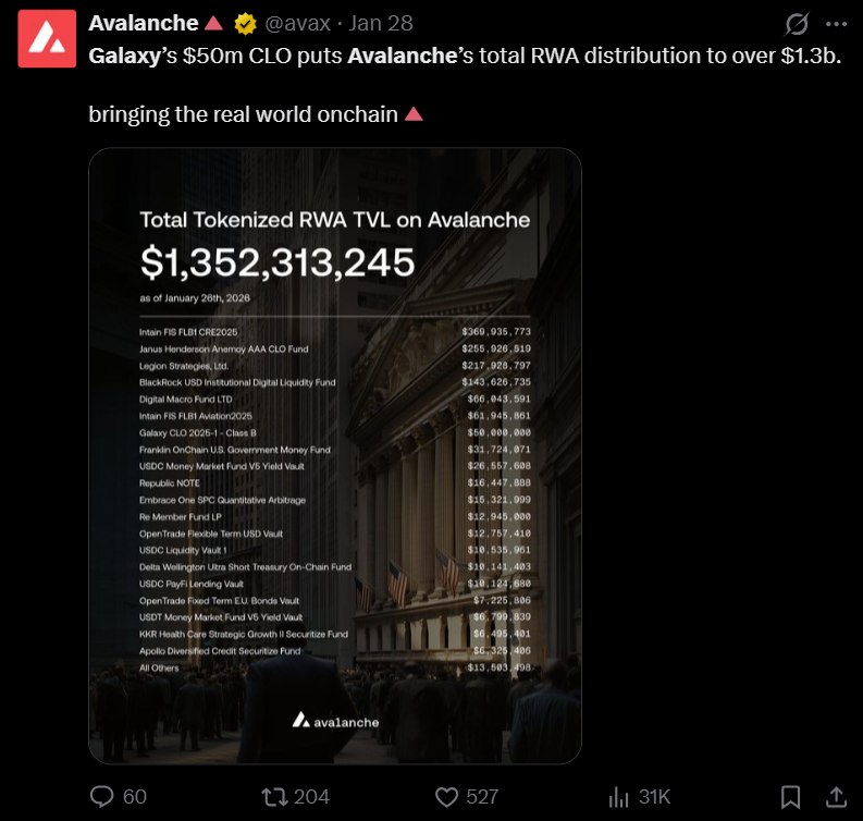 Galaxy在Avalanche区块链上完成一笔7500万美元链上信贷交易,其中5000万美元由机构投资者主导。该笔交易将私有**打包为链上发行的数字证券,实现全流程自动化管理,而非依赖传统后台系统。
