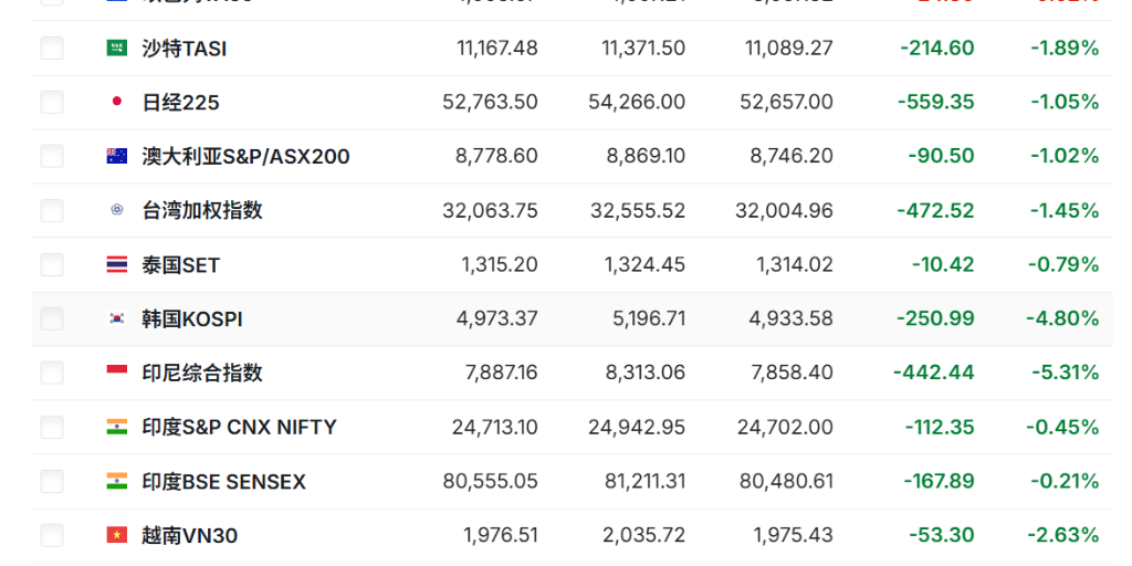 科技股在AI投资前景不确定性加剧的背景下遭遇重创。MSCI亚洲科技指数创下自11月以来**跌幅,韩国Kospi指数作为AI板块风向标暴跌4%,纳斯达克100指数期货下跌超过1%。