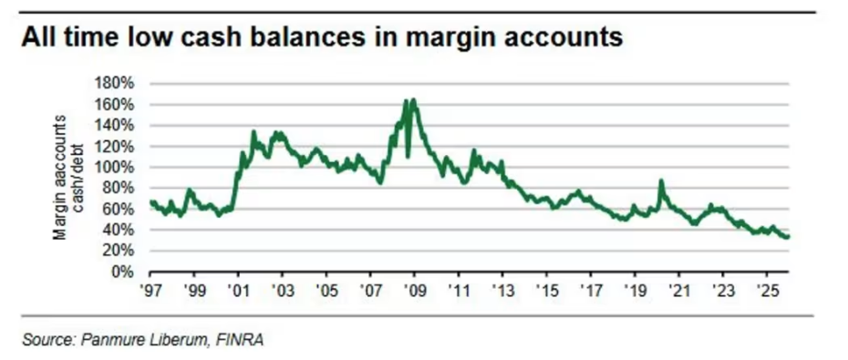 其下方图表显示,美国保证金账户的现金余额与保证金债务的比值已跌至历史新低。