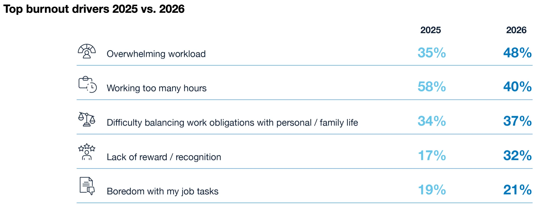 DHR Global 对1500名企业专业人员的调查显示,83%的受访者正经历职业倦怠,其中过重的工作负荷和超长工时是主要原因。