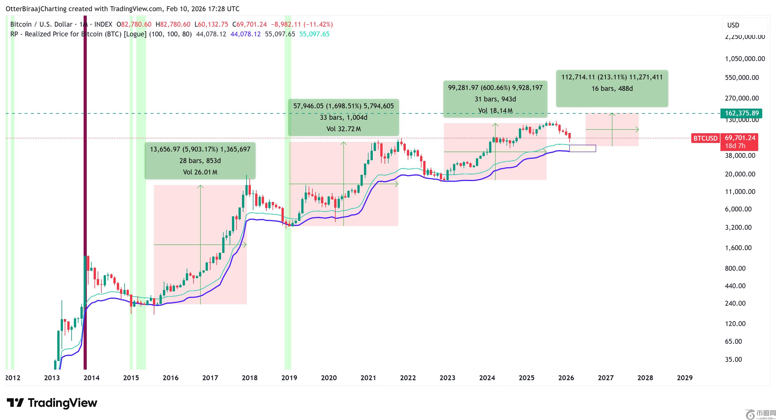 基于已实现价格带的月度价格区间示意图显示,历史数据表明,在重新测试这些区域后,往往伴随显著上涨。尽管后续回报率随时间递减,但整体仍暗示170%至220%的上行空间,与下一轮牛市突破150,000美元的目标高度契合。此外,比特币在测试已实现价格带后通常需经历六至八个月的盘整期,随后恢复上升趋势并创出新高。