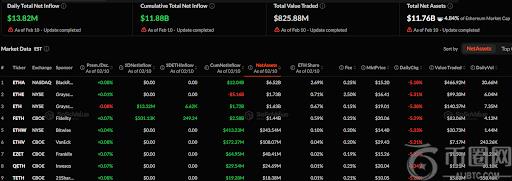 根据SoSoValue截至2月10日数据,所有以太坊ETF单日净流入总额为1382万美元,累计净流入总额达118.8亿美元。总成交额为8.2588亿美元,所有以太坊ETF总资产净值为117.6亿美元,相当于以太坊市值的4.84%。