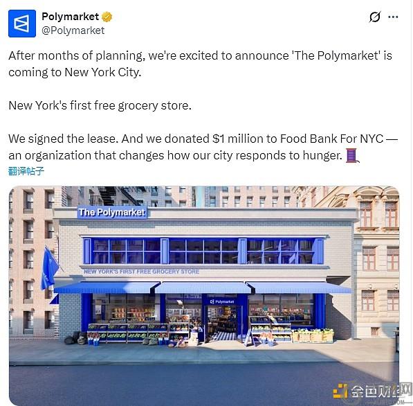 Polymarket在X平台发文强调:“由纽约人打造,服务纽约人。我们已签署租赁协议,同时向纽约市食品银行捐赠100万美元。”