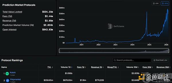 根据DeFiLlama**数据,当前预测市场总锁仓价值达5.34亿美元,7日交易量高达28.24亿美元。其中,Kalshi单日交易量达10.96亿美元,位居**;Polymarket为8.71亿美元,紧随其后。二者合计占**场近70%的交易份额。