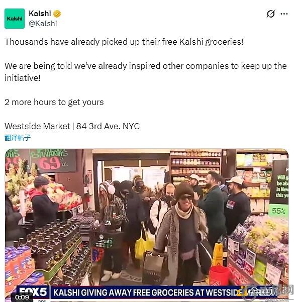 活动由Kalshi在X平台发布,配文称:“已有数千人领取了免费的Kalshi食品!我们听说,这项举措已经激励了其他公司继续推进!还有两小时,快来领取吧!西区市场 | 纽约市第三大道84号。”