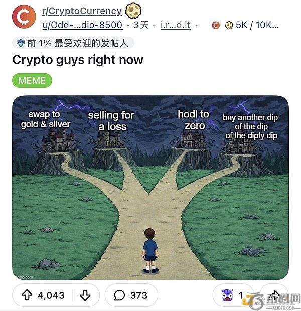图片上有四个选择:买入金或银,割肉 crypto,持有到归零,还是继续**?