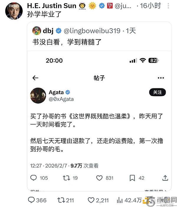 有网友分享:买了孙哥的《这世界既残酷也温柔》,两天读完,七天无理由退货退款,还走了运费险。头一回占到孙哥的「便宜」。