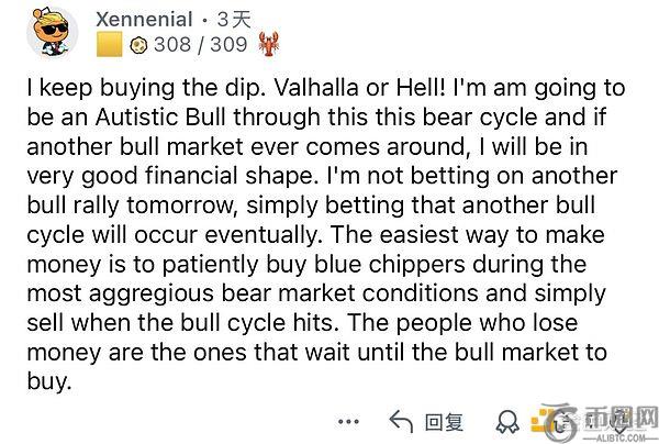 我一直在逢低买入。无论天堂还是地狱,我都认了。我要像「无脑多头」一样熬过这个熊市。如果下一轮牛市真的来了,我的仓位会非常舒服。最简单的盈利模式就是熊市买入、牛市卖出!而亏钱的人,**是等到牛市才开始买的人。