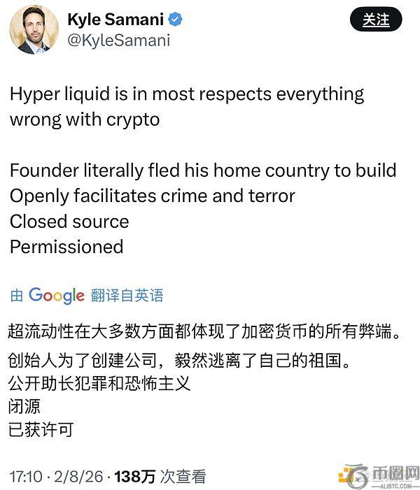 前 Multicoin Capital 联创 Kyle Samani 开炮,炮口对准 Hyperliquid,措辞相当不留情面:「创始人逃离祖国、公然助长犯罪、代码闭源、需要许可,这项目集齐了加密世界所有错误答案。」