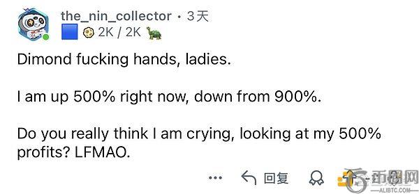 「你觉着我会对着 500% 的利润哭?」有人回撤 10% 就彻夜难眠,有人利润砍半依然觉得只是回调。建议把这条截图裱起来,挂在每一个「该不该止损」的帖子下方。