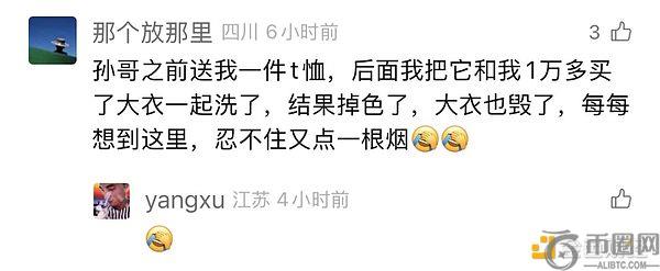 之前收到孙哥赠送的 T 恤的网友,将 T 恤与自己 1 万多买的大衣一起清洗,结果 T 恤掉色了,大衣也被染色了,每每想到这件事都忍不住点了一根烟?