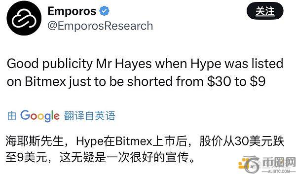 网友表示:海耶斯先生,BitMEX 上线 HYPE 后,价格从 30 美元跌到了 9 美元,这是一种新的「宣传方式」嘛?