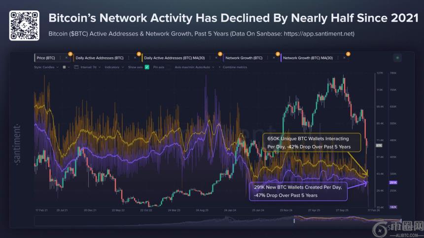 Santiment从长期维度指出,自2021年2月以来,比特币发起交易的**地址数下降42%,新建地址数减少47%。这表明链上生态的扩张动力正在减弱。