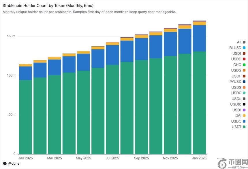 截至2026年2月,共有1.72亿独立地址持有这15种稳定币之一。其中,USDT覆盖1.36亿,USDC达3600万,DAI为470万。三者分布较广,前十大钱包仅持23%-26%,赫芬达尔-赫希曼指数(HHI)低于0.03。
