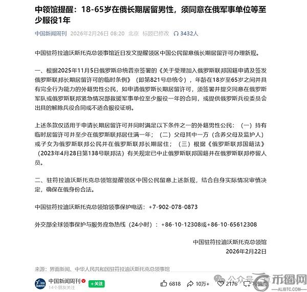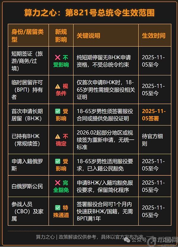 第三步,“打蛇七寸”。2025年,俄罗斯第821号总统令落地,长期居住证的申请规则**变了。要么提交俄军兵役合同,或者提交你不适合服役证明。这一刀,直接砍向了大批赴俄挖矿的外籍男性从业者——他们原本指望注册个体户或公司拿长期居留,现在这条路,堵死了。