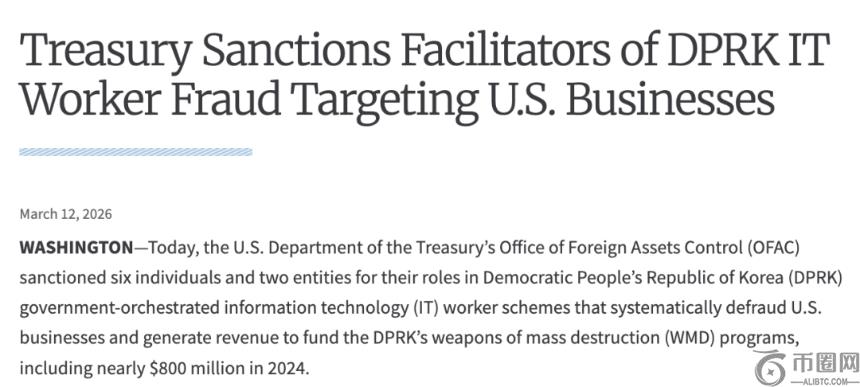 美国财政部外国资产控制办公室(OFAC)于3月12日宣布,对参与朝鲜操控的跨国IT工作者欺诈网络的6名个人及2家实体实施**制裁。该网络通过**身份、盗用简历等手段,系统性骗取美国企业信任,将海外劳工薪资转移至朝鲜,用于支持其大规模杀伤性武器与弹道**项目,仅2024年涉案金额已接近8亿美元。