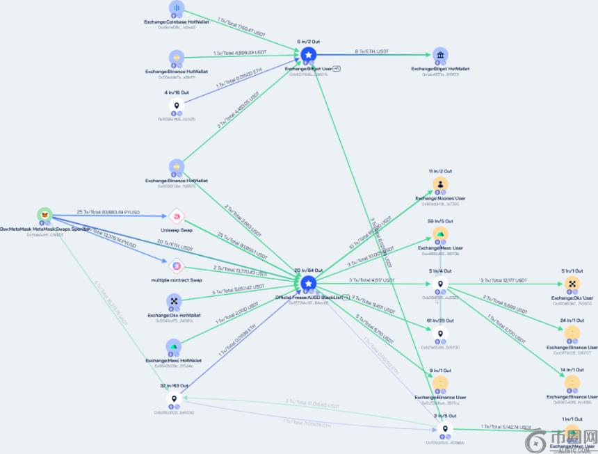 AMNOKGANG TECHNOLOGY DEVELOPMENT COMPANY旗下多个地址合计流出超205枚ETH、逾50万枚USDT与USDC,其中部分资金通过BSC与ARB链路转入**化交易所。