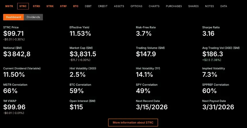 Odaily注:STRC 的所有数据都可以在 Strategy.com 上找到。以下截图来自 2026 年 3 月 13 日,当天为除息日,因此 STRC 的价格会低于面值。