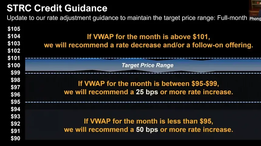 Strategy 目前给出的指导原则是:如果 STRC 的月度 VWAP(成交量加权平均价)在 95–99 美元之间,他们将提高 25 个基点(bps)的股息率;如果月度 VWAP 低于 95 美元,他们将提高 50 个基点;如果 月度 VWAP 高于 101 美元,他们则会**股息率。