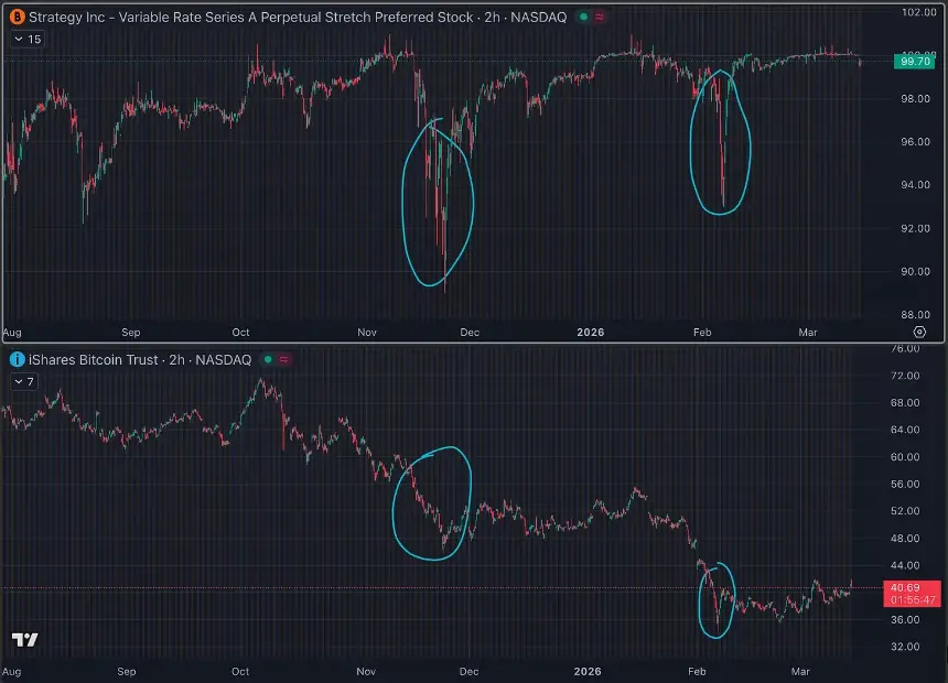 Odaily注:IBIT(BlackRock 比特币 ETF)**的几次下跌通常也会伴随 STRC 的下跌。