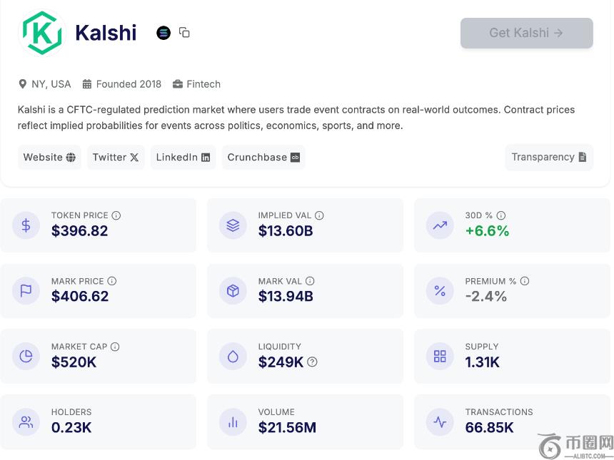 PreStocks 平台,股票**盘前价格为 397 美元左右;(相较于我们 1 个月前在《Kalshi 交易量续破新高,盘前股价多少合理?》一文中的 369 美元已增长近 30 美元,涨幅达 7.6%)