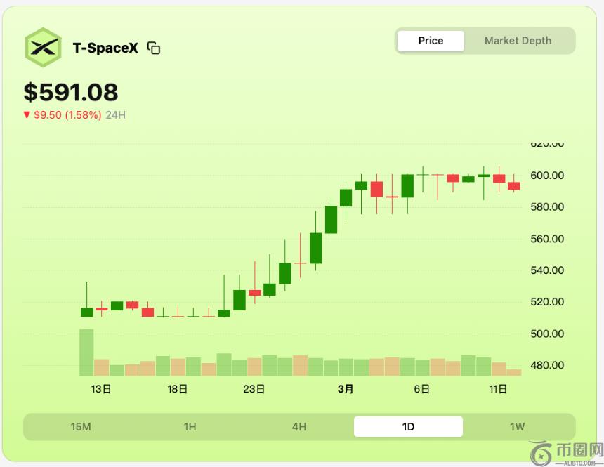 换言之,SpaceX 股票盘前价格在两大平台上的价差为 75 美元左右,价差率约为 12.7%。