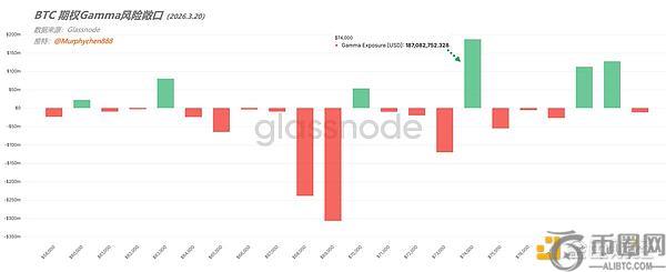 从3月20日到期的伽玛风险敞口(GEX)来看,74,000美元附近存在约1.8亿美元的Long Gamma敞口,表明该区域做市商对冲压力较小,价格更易在此震荡整理,客观上形成阻力区。