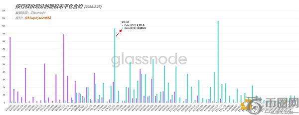 随着3月20日行权日过去,下一个关键节点3月27日的期权结构发生显著变化。数据显示,75,000美元行权价成为最集中看涨期权聚集区:有9,685 BTC的Call未平仓合约,而对应Put仅2,711 BTC,明显偏多。