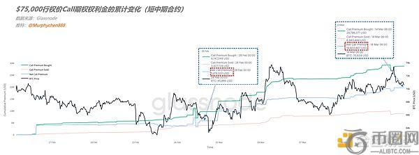 仅看未平仓量仍不足以判断做市商是否处于风险敞口状态,还需观察权利金流动趋势。数据显示,在2月28日至3月14日期间,75,000美元行权价的Call净权利金从580万美元飙升至1,980万美元,且呈加速上升态势,而当时比特币价格仍在66,000至68,000美元区间震荡。