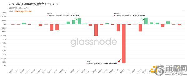 结合3月27日到期的伽玛风险敞口(GEX)分析,75,000美元附近出现约-25.6亿美元的显著Short Gamma敞口,与3月20日的Long Gamma形成本质差异。
