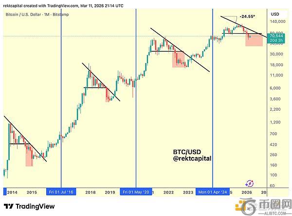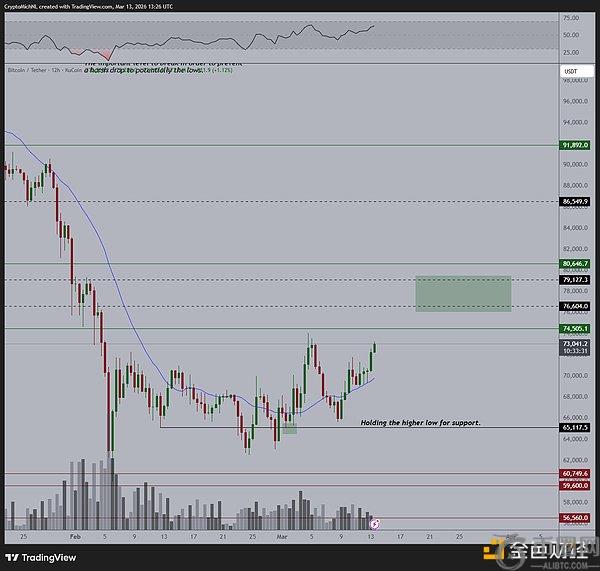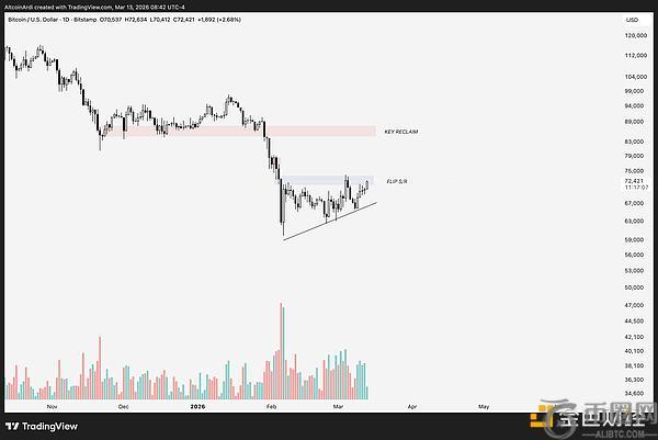 MN Capital创始人Michaël van de Poppe表示:76,000至79,000美元为关键阻力区,若突破或将带动山寨币市场情绪。同时,若形成月线吞没形态,将**抹除二月回调,但也有新低出现的风险。