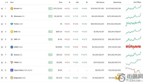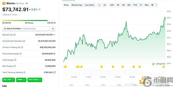 自3月10日起,比特币价格从约6.9万美元攀升至**逾7.4万美元,累计涨幅超过7.24%,截至发稿报73742.91美元。与此同时,以太坊(ETH)、BNB、XRP、SOL等主流加密货币也迎来普遍上涨,7日涨幅均接近10%。