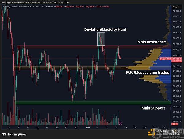 交易员Daan Crypto Trades指出:72,000美元和62,000美元构成关键分界线,控制点(PoC)约为68,000美元。“介于两者之间的**波动都可能带来剧烈震荡。该区间或需数周才能明确方向。”