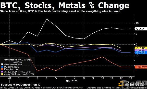 比特币股权公司 Horizon 的增长主管 Joe Consorti指出:“自上月伊朗遭受空袭以来,比特币是表现**的主要资产……BTC通过了地缘政治压力测试。”