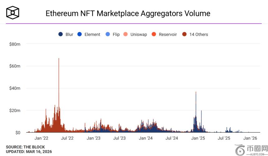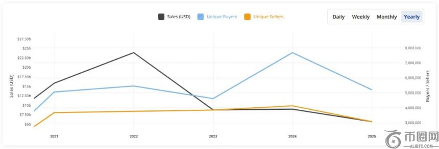 数据显示,2025年全年NFT销售额为56.3亿美元,同比下降37%;供给端**至13.4亿枚,均价从124美元降至96美元,总市值约24亿美元。行业整体陷入停滞。