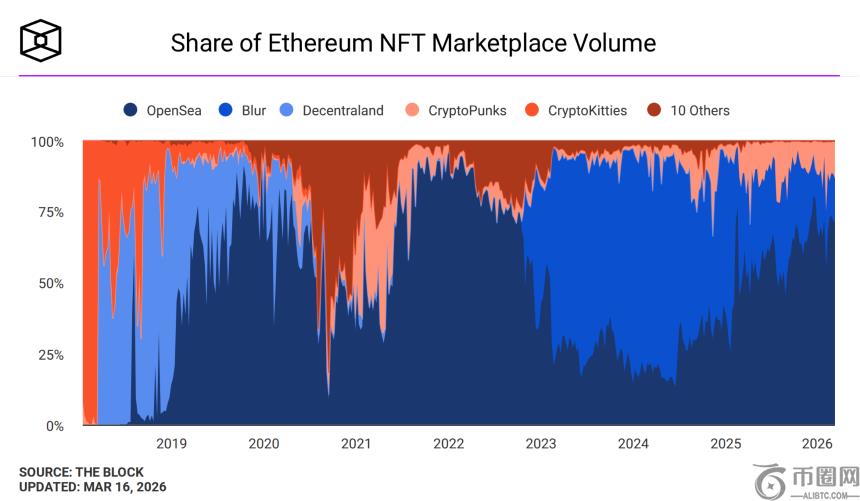 尽管如此,OpenSea在以太坊NFT交易市占率仍保持约71%,且2025年10月月交易量达26亿美元,其中超过90%来自**交易。这表明平台正逐步从纯NFT生态转向多资产交易场景。