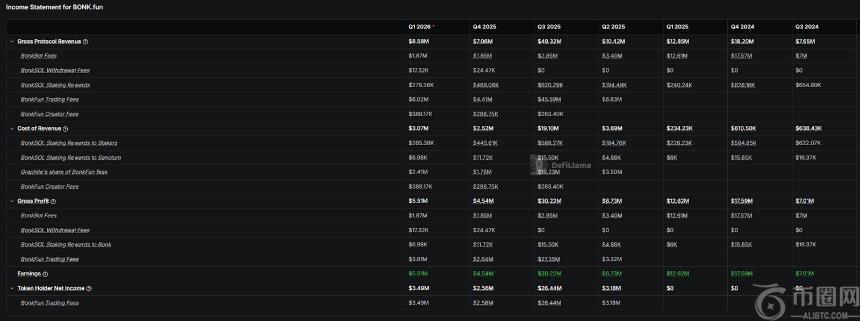 不过,BONK生态本身并未同步熄火。截至目前,BONK.fun 2026年**季度协议收入约851万美元,已高于2025年第四季度的706万美元。其中,当前季度约有600万美元来自Bonk.Fun,约184万美元来自BonkBot。