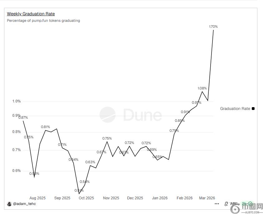 回顾Pump.fun本身的数据,其表现维持了**的高水准。最近两周的粗略数据显示,Pump.fun当前日均发币量约为2.97万个,日均活跃钱包约为15.77万个,日均成交额约为9365万美元,日均收入约为87万美元。与此同时,长期被视为平台软肋的**率也出现了修复迹象,近期甚至一度冲高至1.70%左右。虽然这一短期高点背后的具体原因尚不明确,但Pump.fun的**效率确实在回暖。