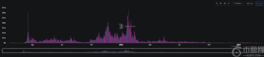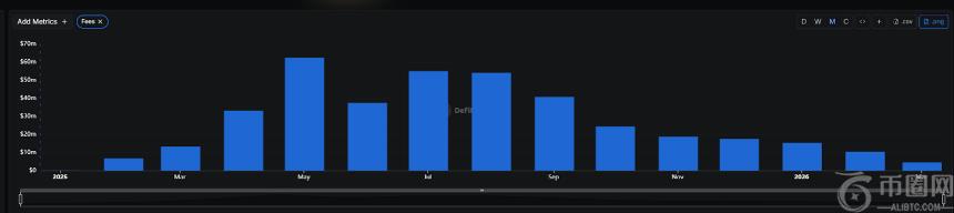 按DeFiLlama截至3月16日的数据,Photon累计收入约4.38亿美元,但单季度收入已从2025年**季度的1.228亿美元依次下滑至第二季度的3231万美元、第三季度的1899万美元、第四季度的529万美元,2026年**季度截至目前仅为452万美元,呈现出近乎阶梯式坠落的趋势。