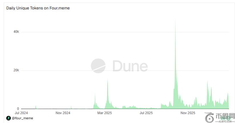 按Dune追踪的最近10天可见数据,Four.meme日均发币约4858个,日均用户约5749个,日均真正上线DEX Pancake的**仅25.7个,短期**率进一步压低至0.53%左右。这些数据表明,当前的Four.meme正处在低位运行状态,与2025年10月**日均422万美元收入相比,目前收入已降至20~30万美元水平。