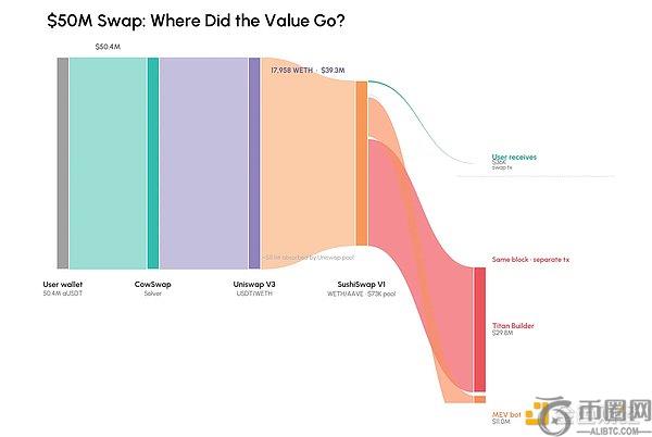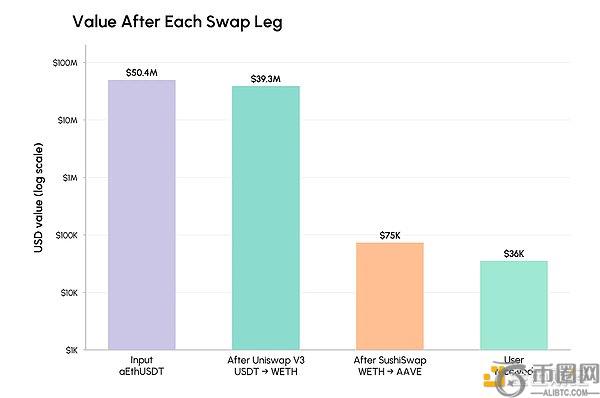 偿还闪电贷后,该机器人留存约4824枚WETH(约1000万美元),其余约13087枚WETH(约2990万美元)作为区块排序费支付给泰坦构建者。整个过程在单个区块内完成,用户损失的价值几乎**转移至套利方。