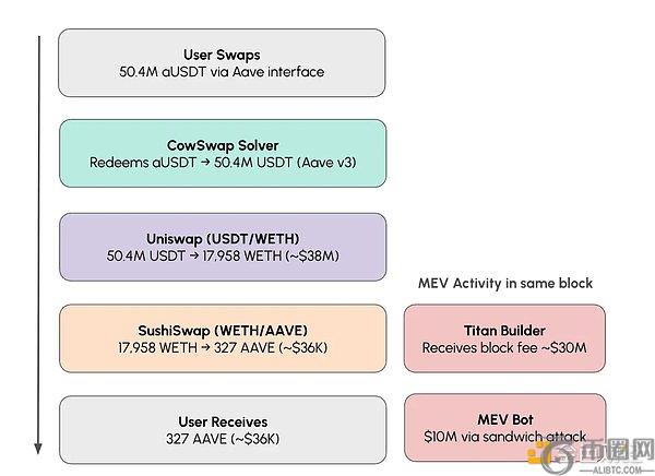 该笔交易最初由用户在Aave协议中发起,其持有的aEthUSDT头寸被路由至CoW Protocol——一个第三方去**化交易聚合器,用于寻找**路径。然而,在资金流转过程中,由于路径选择不当,**进入流动性极低的SushiSwap WETH/**VE交易池,引发剧烈价格冲击。