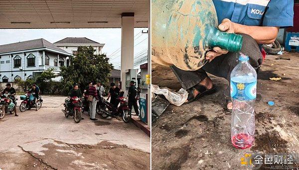 慢慢地走近看,当地的加油站员工满脸严肃,正拿着沾满泥泞的塑料水桶给大家加着油,而加油的工具却是大家平时喝水用的矿泉水瓶,每个人刚刚能打一瓶。看着他们小心地往水瓶里倒着汽油这粉色的液体,我才真正体会到,我现在站着的地方已不是**,而是在老挝的琅南塔省勐醒县里,一个极度贫困,却又生机勃勃的土地上,而这片土地上好不容易长出来的工业,正面临着**重的干旱。