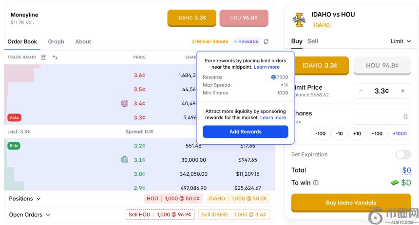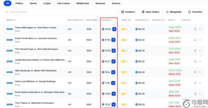 **步:打开Polymarket Rewards页面,按补贴力度排序,可发现当前**补贴**集中在NC**赛事。建议优先选择开赛时间较晚的比赛,如美东时间3月19日(北京时间3月20日)的“爱荷华大学VS休斯顿大学”。