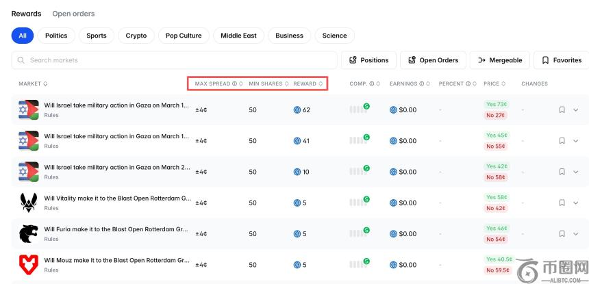 所谓LP奖励,是Polymarket为改善平台流动性而发放的真金白银补贴,所有信息可在官方Rewards页面实时查看。用户需在指定事件中,于**价差范围内挂出**份额的订单,即可自动累积奖励。挂单越接近市价,效率越高,且每日8:00统一发放,仅对超过1美元的部分结算。