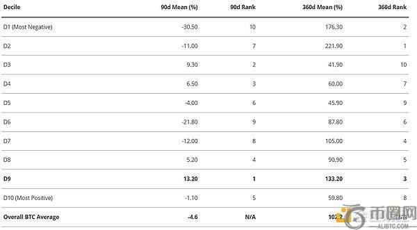 下表将所有历史期权偏度读数等分为10个区间(**位数),从D1(看跌期权相对最便宜)到D10(看跌期权最贵)。当前读数落在D9,即第二高的区间。对于每个**位数,表格显示了随后90天和360天的比特币平均回报,以及该回报在所有**位数中的排名。D9产生了**的90天平均回报( 13.2%,排名**)和第三强的360天平均回报( 133.2%),这表明,在当前水平上极端的看跌期权需求,在历史上往往出现在价格显著复苏之前。