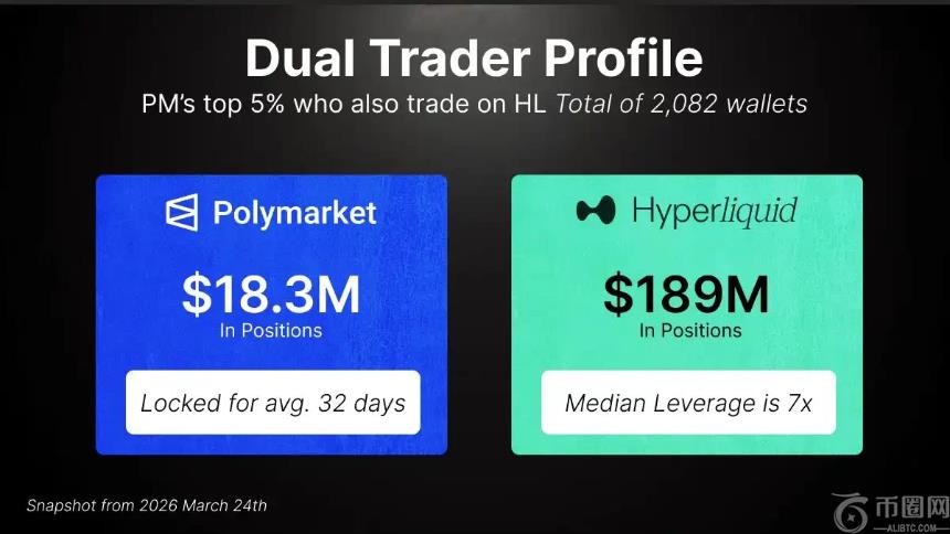 一项研究分析了近1.5万个 Polymarket 活跃地址后发现,头部交易者中有不少人同时也活跃在 Hyperliquid。这批重叠用户在 Polymarket 上贡献了约14.3亿美元的成交量,同时在 Hyperliquid 上运营着总计约1.89亿美元的合约仓位,保证金使用规模约为2900万美元。