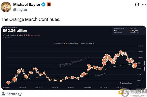 其次,对于Strategy而言,BTC已经成为了信仰。Michael Saylor将比特币定位为“Digital Capital(数字资本)”,称其为21世纪的**储备资产。3月22日,Saylor表示:“橙色进军仍在继续。”尽管上周末市场暴跌导致该公司比特币投资亏损10%,但公司仍增持了比特币。
